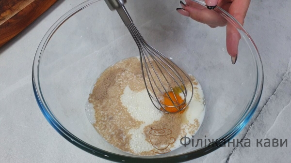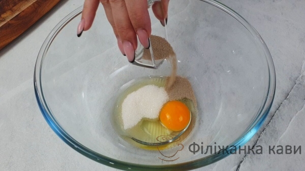 У мисці змішуємо яйце, 2 столових ложки цукру, 4 грами сухих дріжджів і 145 мл теплого молока.