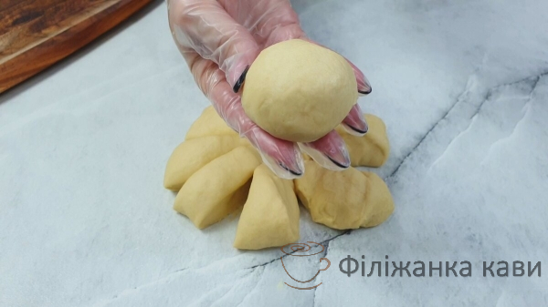 І вимішуємо поки тісто не стане гладким. Формуємо з тіста кулю і ділимо його на 9 частин.