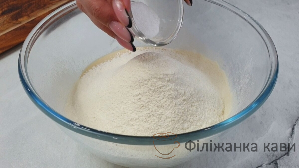 Просіюємо 300 грамів борошна і додаємо 1 чайну ложку солі.