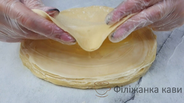 Таким же чином укладаємо всі 9 кіл. Останнє коло тіста не змащуємо.