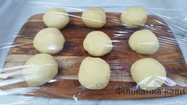 Викладаємо на дошку. Тісто накриваємо харчовою плівкою або рушником і залишаємо на 15 хвилин.