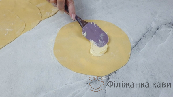 Беремо одне коло тіста і змащуємо всю поверхню розм’якшеним вершковим маслом.