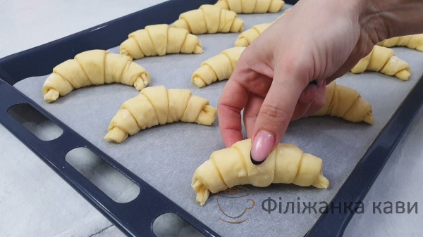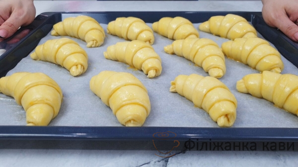 Викладаємо рогалики на деко, застелений пергаментом. Накриваємо деко рушником і залишаємо підніматися на 2-3 години.