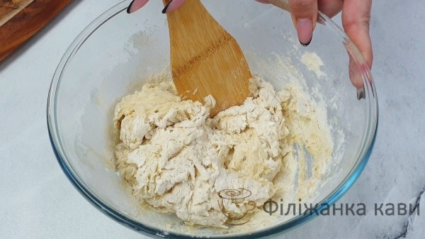 Замішуємо тісто, спочатку лопаткою, потім руками.