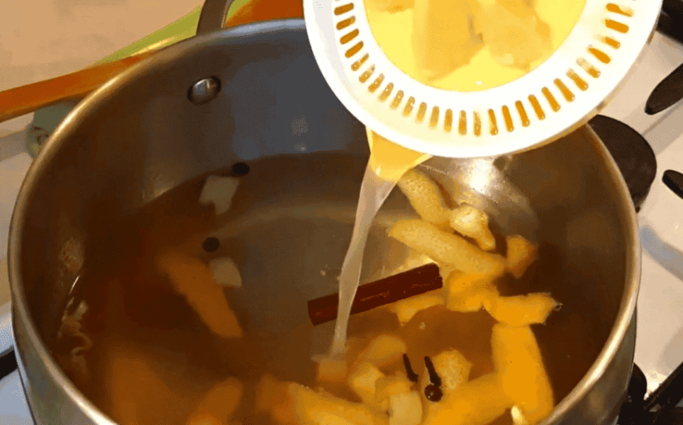 Тепер підготую маринад. У воду насипаю цукор, усі необхідні спеції, імбир, цедру лимона і ставлю на вогонь, щоб все закипіло.