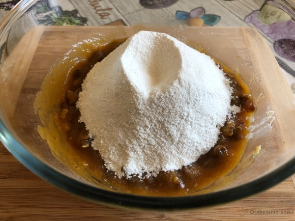 Борошно змішуємо з розпушувачем і просіюємо до решти інгредієнтів, замішуючи тісто.
