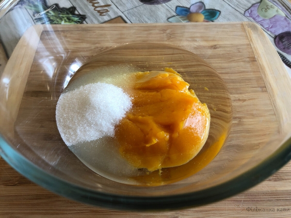 До гарбузового пюре додаємо цукор, олію і перемішуємо.