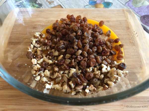 Тепер додаємо сіль, спеції ( я додаю 1 ч.л. імбиру і 0,5 ч.л. кориці ), волоські горіхи і родзинки. Ще раз добре перемішуємо.