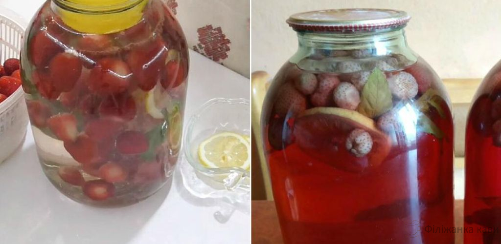 - В стерильну трилітрову банку покладіть декілька листочків м’яти, три шматки лимона та ягоди полуниці.