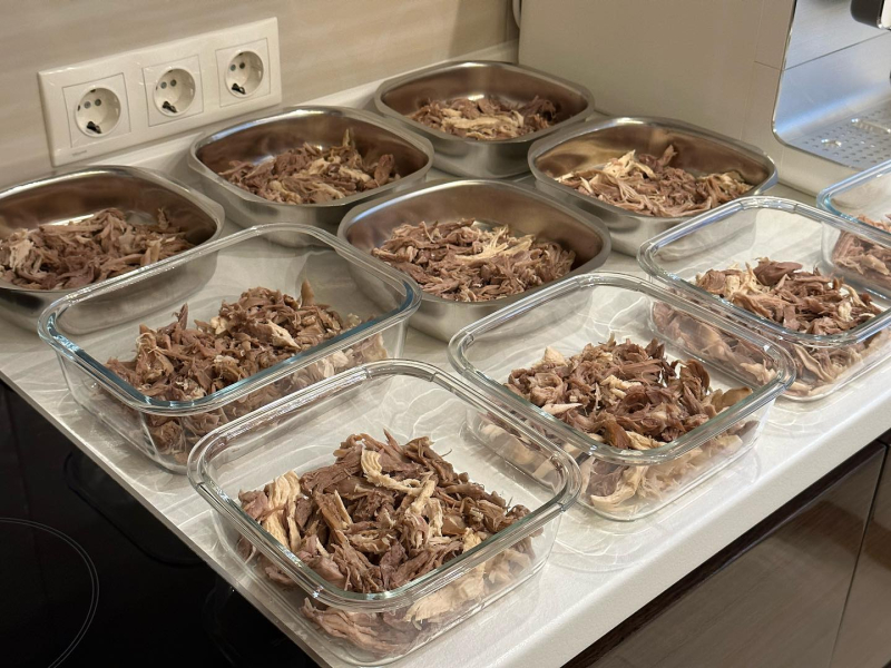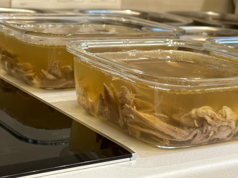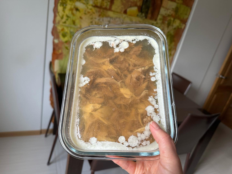 Приблизно через 10 годин вибираю все м’ясо з бульйону, ретельно перебираю