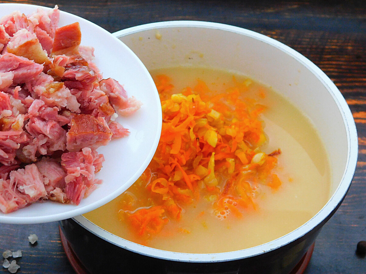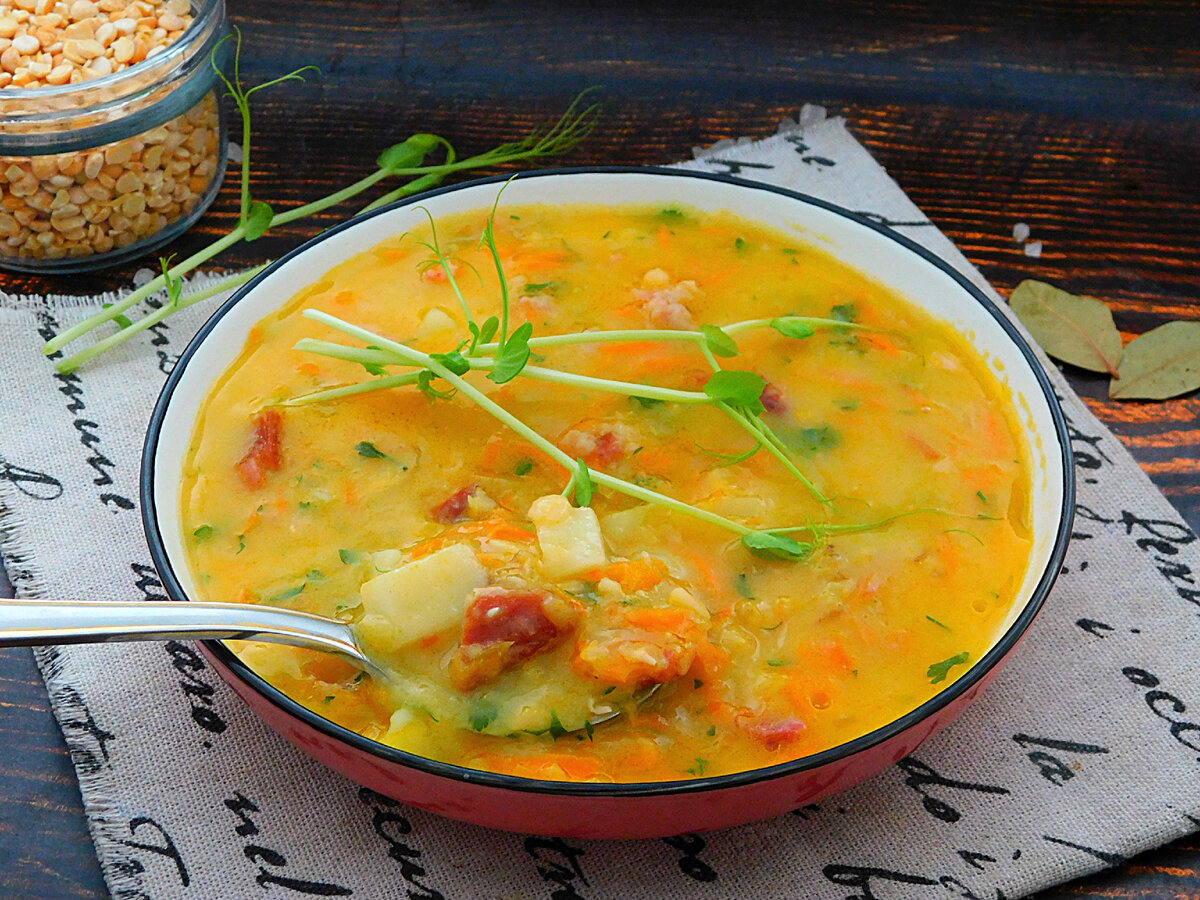 Сьогодні готуємо ситний і ароматний гороховий суп з копченостями. Вариться він досить довго, але результат вартує витраченого часу. Горох практично повністю розварюється, роблячи суп густим. Враховуйте, що при охолодженні він ще сильніше густішає, але, в разі потреби, в будь-який момент можна підлити води і дати знову закипіти.