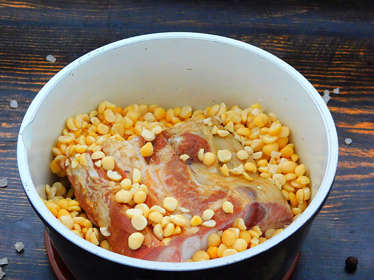 У каструлю викласти копчені ребра, висипати горох.