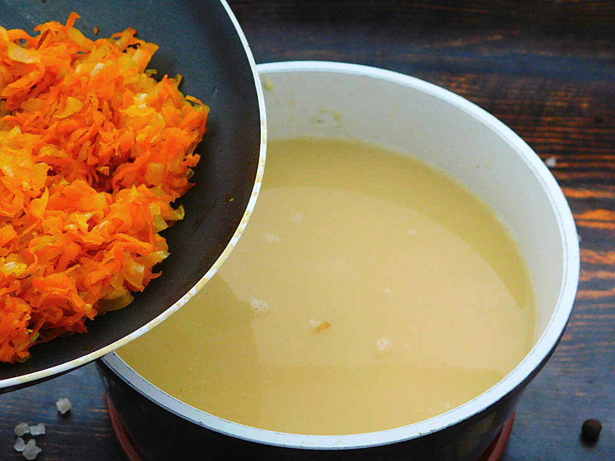 У суп викласти тушені моркву з цибулею.