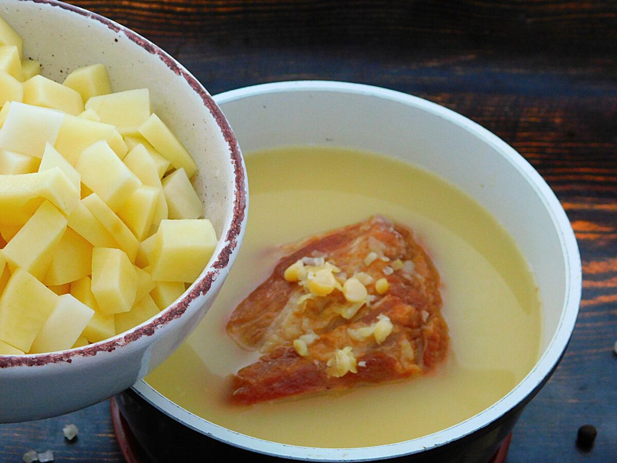 Влити воду, довести до кипіння. Знімати білу піну в міру її появи. Варити 1-1,5 години до м’якості гороху. Також судити можна за кольором рідини, коли він стане кремовим – горох почав розварюватися. Висипати нарізану картоплю і продовжити варіння.