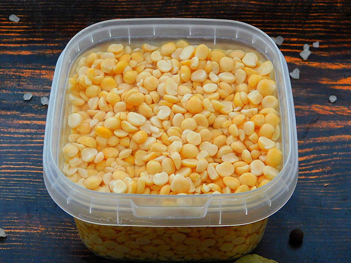 Горох промити, поки рідина не стане прозорою. Залити водою і залишити на 2 години. Горошини розбухнуть.