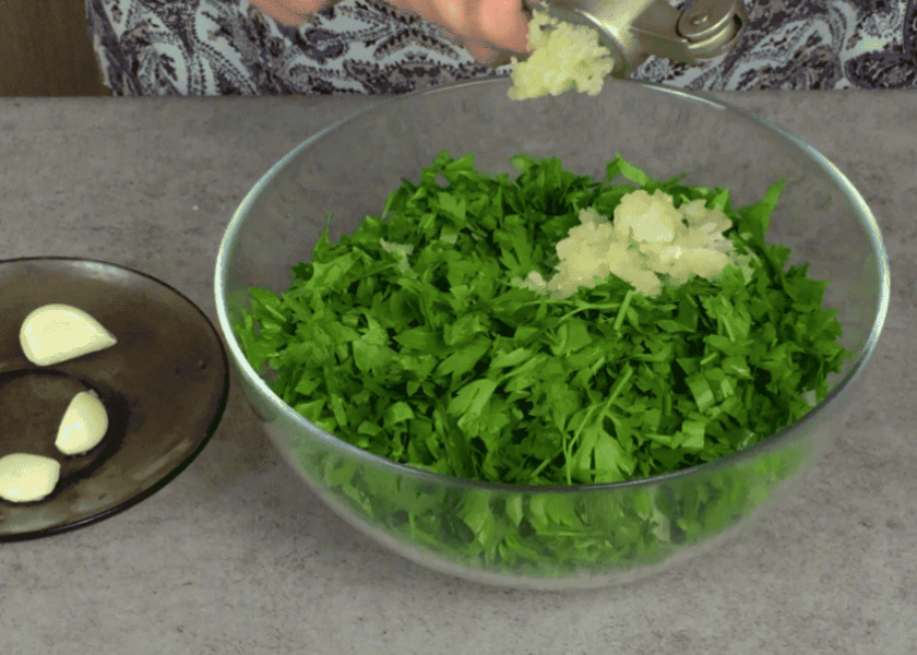 Додаю дрібно нарізану петрушку. Видавлюю часник через прес і перемішую.