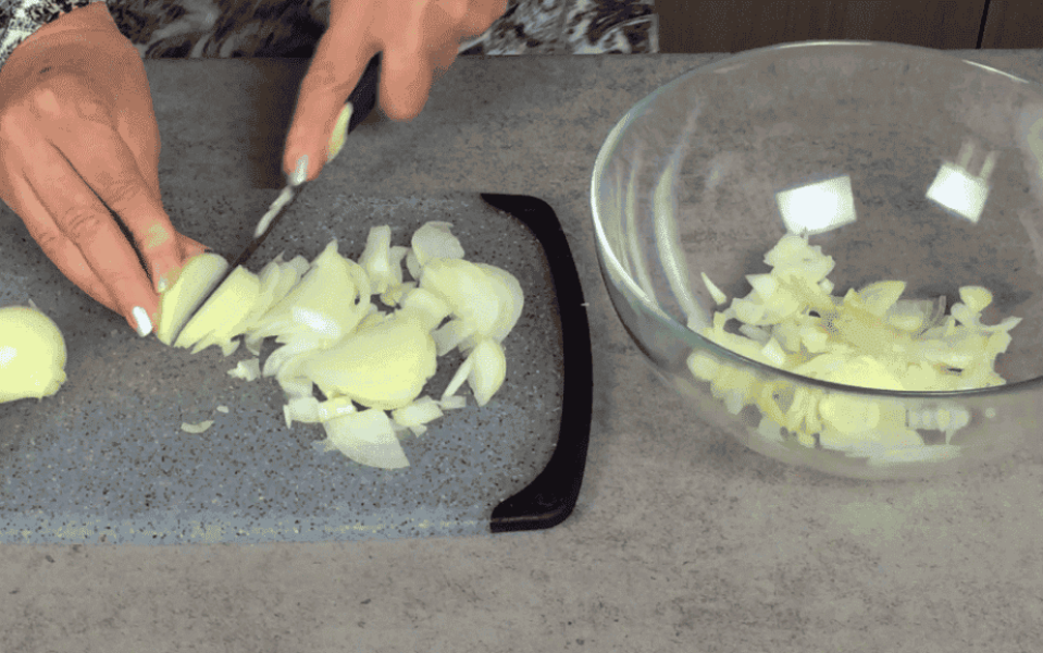 Поки баклажани остигають цибулю, нарізаю соломкою і перекладаю в миску.