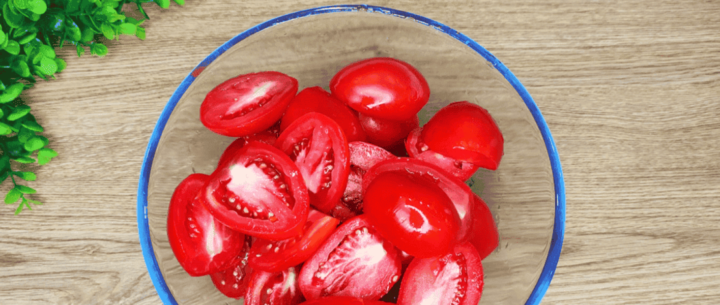 Помідори розрізаємо навпіл, зрізаємо хвостики