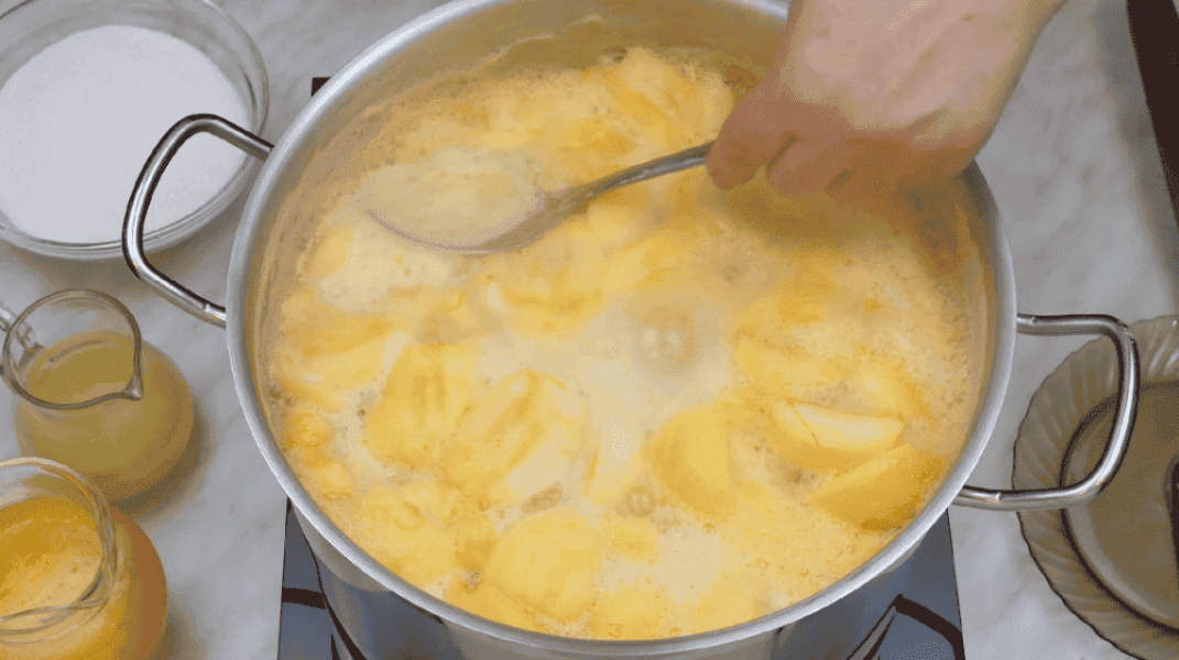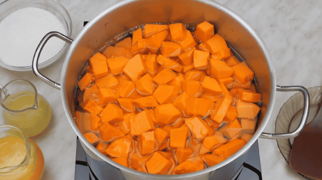 На великому вогні доводимо до кипіння, зменшуємо нагрівання і під кришкою варимо до м’якості гарбуза, періодично знімаючи піну, що утворилася. Як правило, на це потрібно 15-20 хвилин.