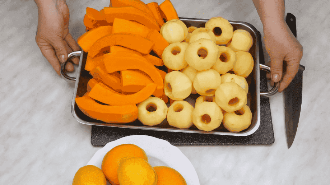 Я очистила гарбуз від насіння та шкірки, а з яблук видалила серцевину і зняла з них шкірку. І у мене на підносі по 2 кг вже очищених гарбуза та яблук.