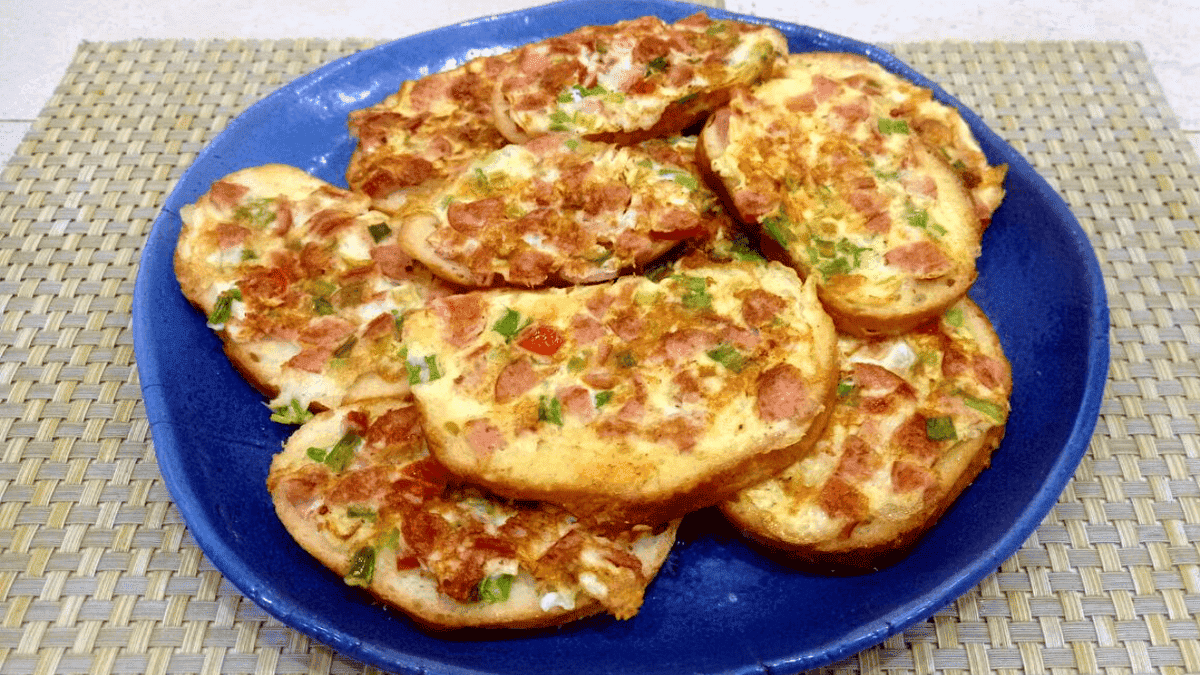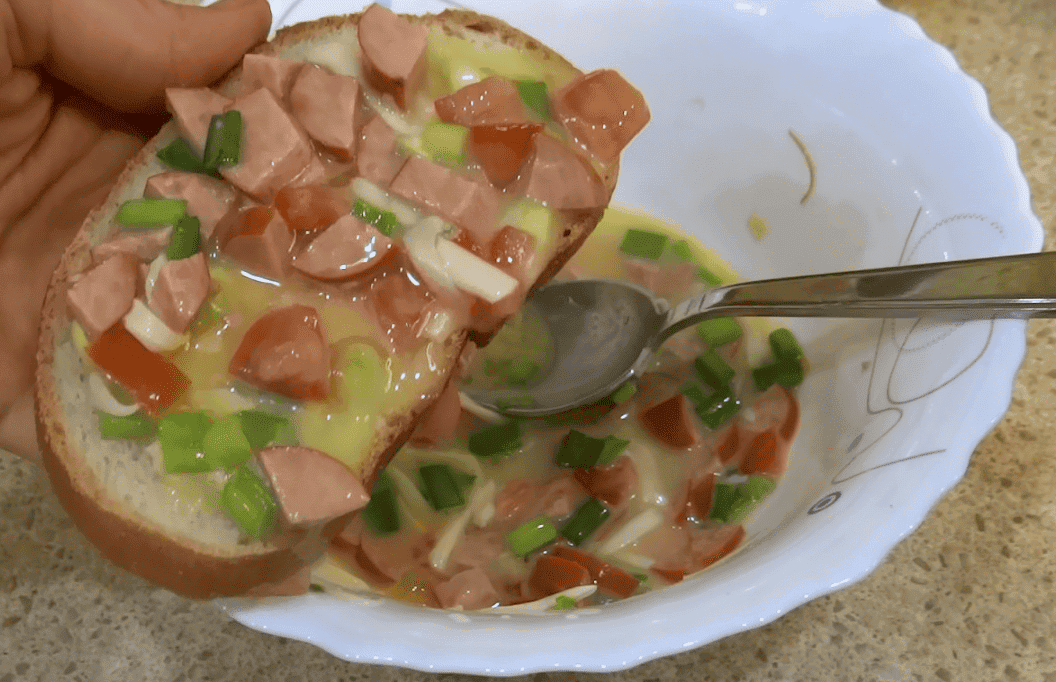 Суміш викладаємо на скибочки батона за допомогою ложки, рівномірно розділимо по всій скибочці.