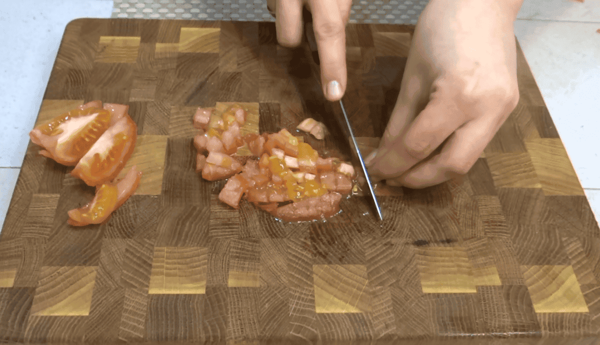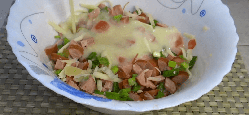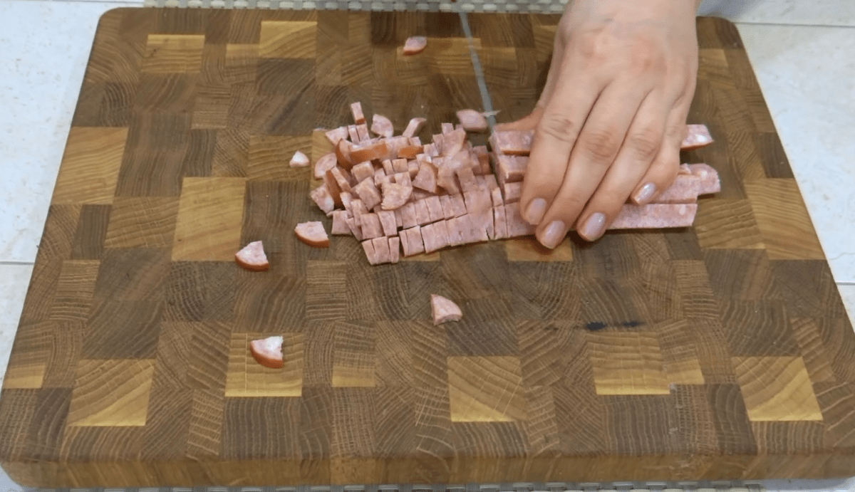 Ковбасу або сосиски дрібно нарізаємо ножем.