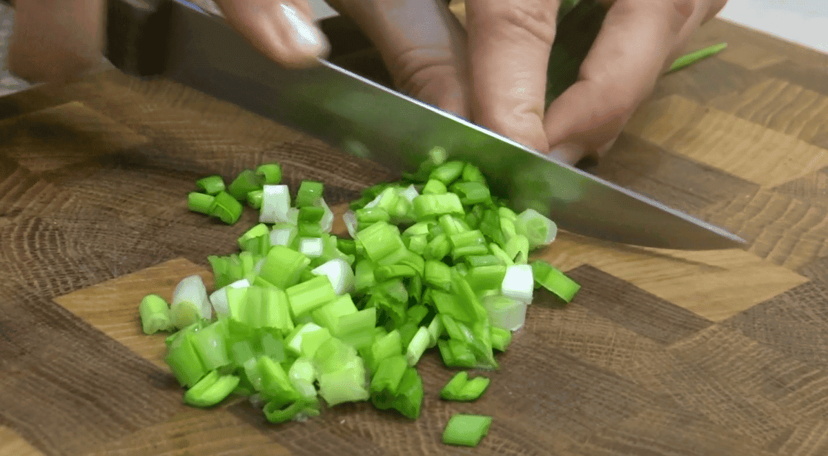 Пір’я зеленої цибулі дрібно шинкуємо.