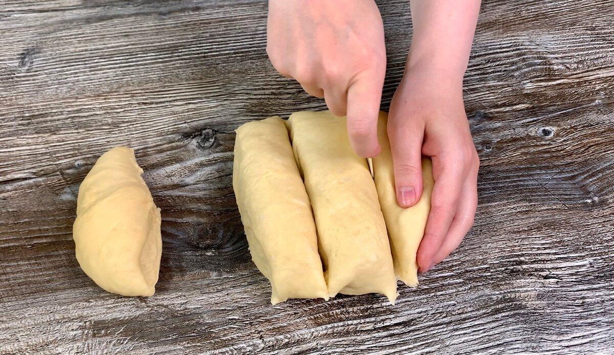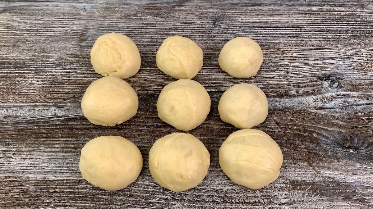 4. Через годину тісто обминаємо, ділимо на 7 – 9 рівних частин і формуємо кульки. Готові кульки накриваємо рушником і даємо постояти 10 хвилин.