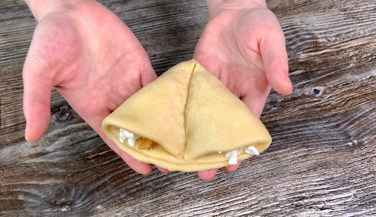 6. Загинаємо кожен край, як показано на фото, формуючи форму ріжків і ретельно защипуємо тісто в середині.