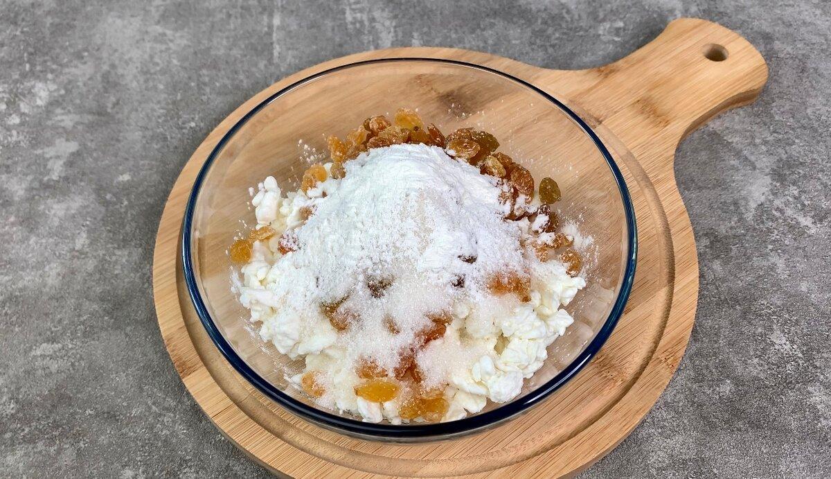 Для начинки змішуємо сир, родзинки, цукор і крохмаль.