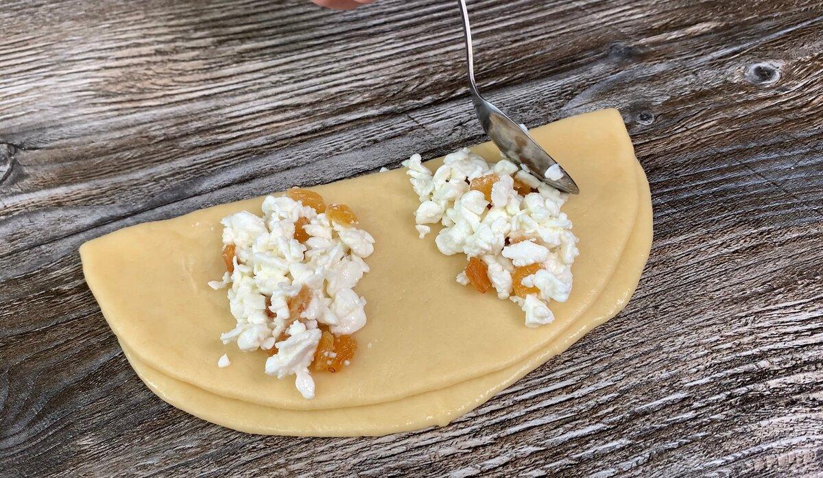 5. Розкочуємо кожну кульку, змащуємо розтопленим вершковим маслом, складаємо навпіл і викладаємо з двох сторін начинку.