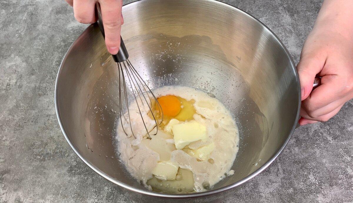2. Через 15 хвилин вбиваємо яйця, солимо, додаємо олію і розм’якшене вершкове масло. Ретельно перемішуємо і просіваємо борошно.