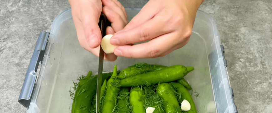2. У потрібну ємність укладаємо шарами перець, рубаний кріп, лавровий лист, чорний перець горошком, і кілька зубчиків часнику в пластинах.
