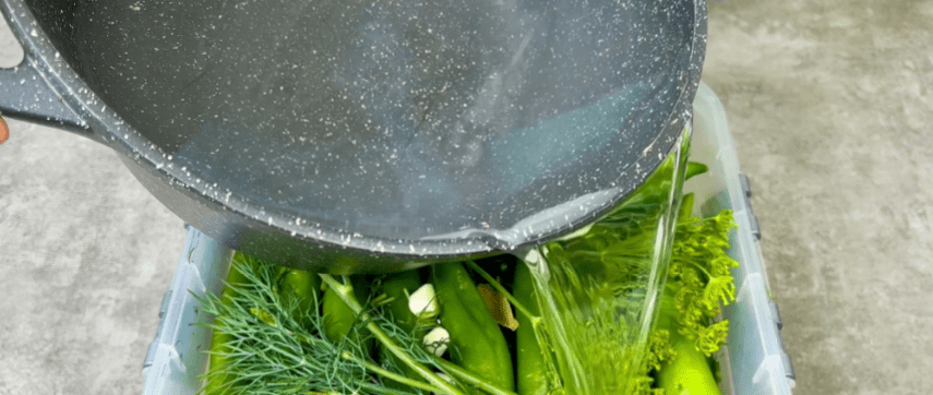 4. У каструлю з холодною водою всипаємо сіль, перемішуємо до повного розчинення та заливаємо перці холодним розсолом.