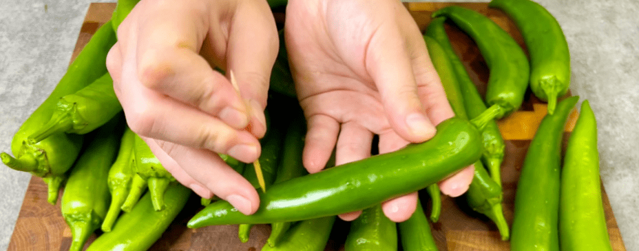 1. У перців підрізаємо (укорочуємо) довгі хвостики і робимо кілька проколів за допомогою звичайної зубочистки.