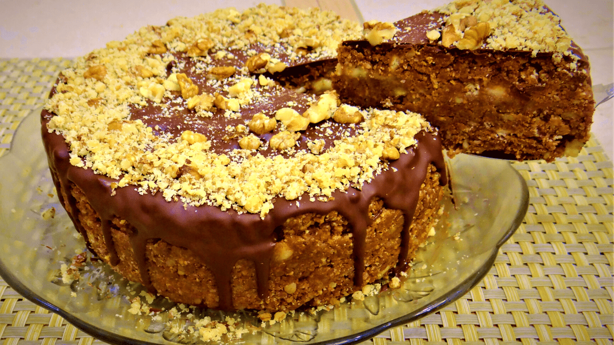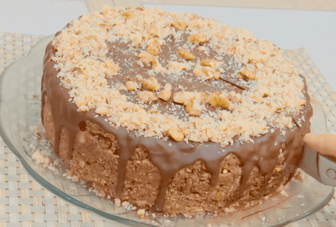 Залити торт шоколадом, прикрасити горіхами і можна відразу подавати до столу, тому що додаткове просочення тортику не потрібно.