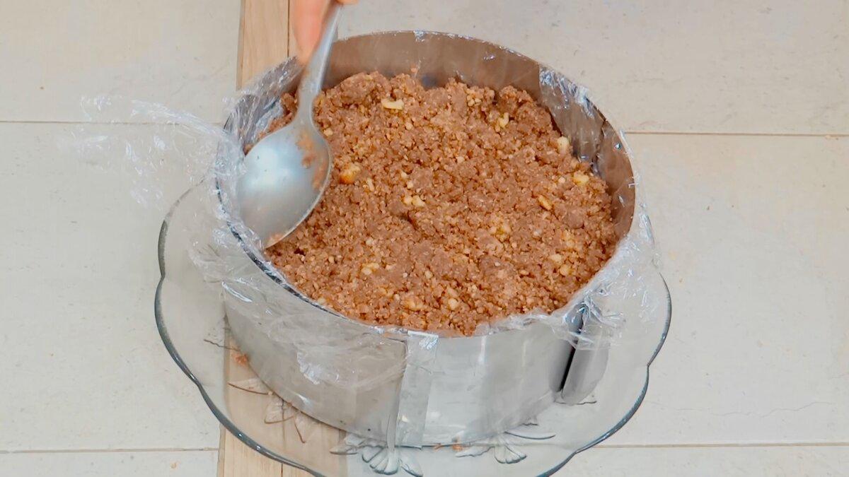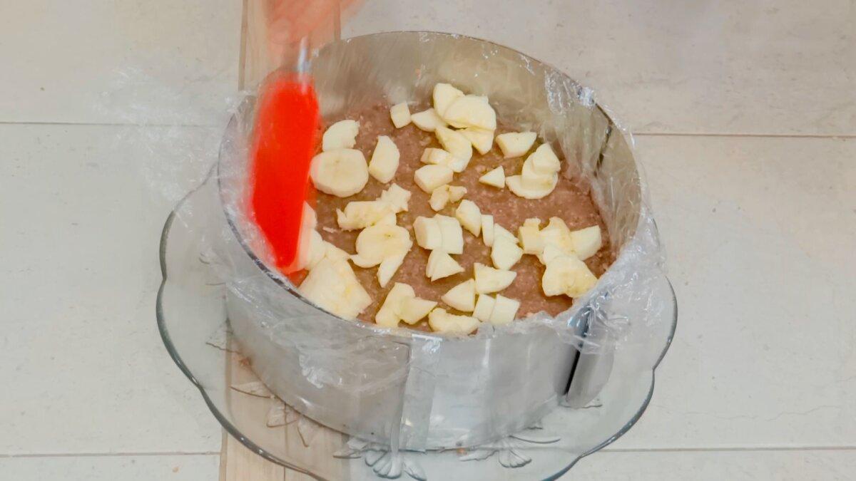 З цієї маси ми і будемо формувати тортик. Я використовувала сервірувальне кільце і тарілку, боки кільця вистилала харчовою плівкою. Викласти 2/3 маси, утрамбувати за допомогою лопатки, при бажанні додати подрібнений банан, тому що він відмінно поєднується з шоколадною крихтою.