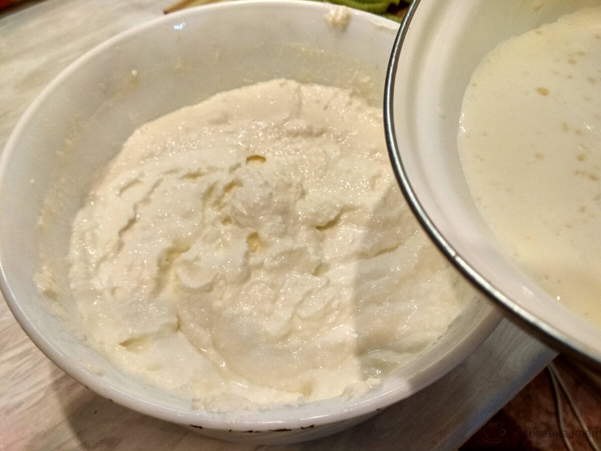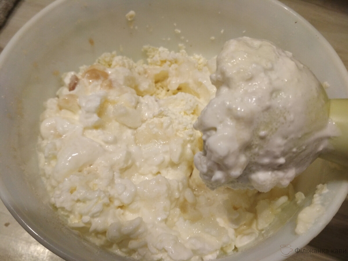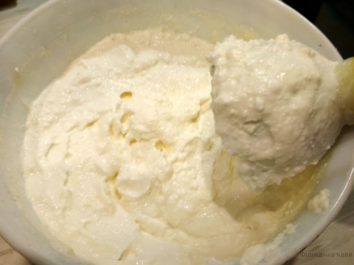 Збиваю нашу масу до однорідності. Правда хотіла, щоб сир був не такий рідкий, але нічого страшного.