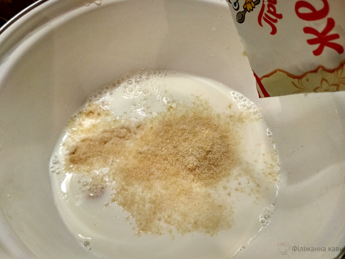 Потім беру зручну, у мене це залізна чаша, виливаю в неї молоко і ставлю на середній вогонь. Висипаю пакетик желатину.