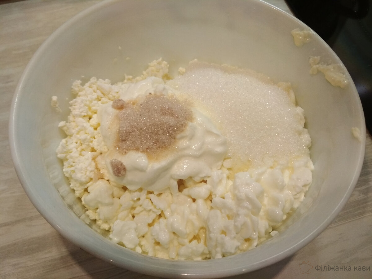 Далі відразу до сиру додаю цукор, сметану і ванільний цукор.