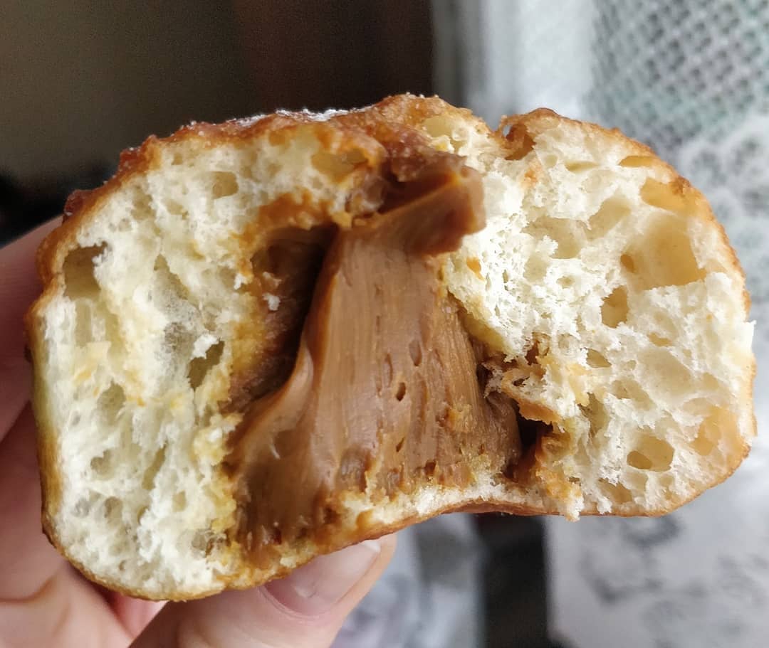 6. Готові пончики викладаємо на паперовий рушник. Начиняємо начинкою на свій смак за допомогою кондитерського шприца. Я використовувала збите варене згущене молоко з вершковим маслом.