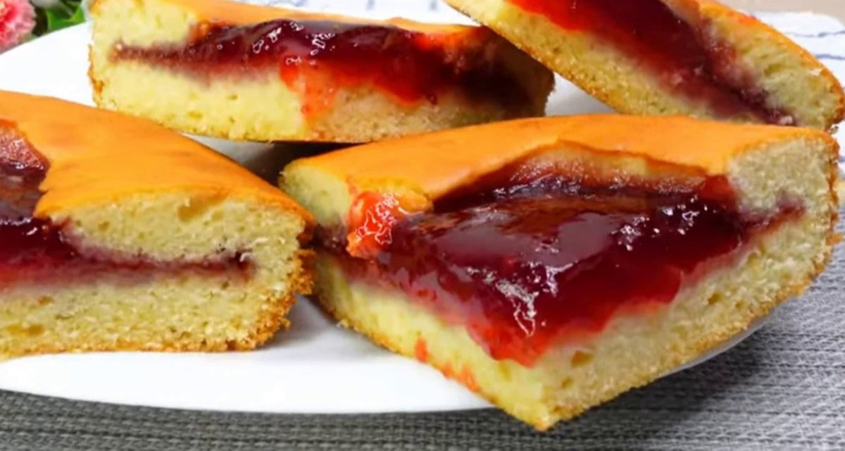 - Зверху змащуємо варенням та заливаємо другою половиною тіста. Ставимо в духовку на 30 хв, за 180 градусів.
