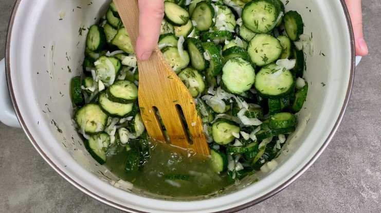 - Накриваємо кришкою та прибираємо в холодильник на 12-14 годин. Огірки за 12 години дадуть багато соку.