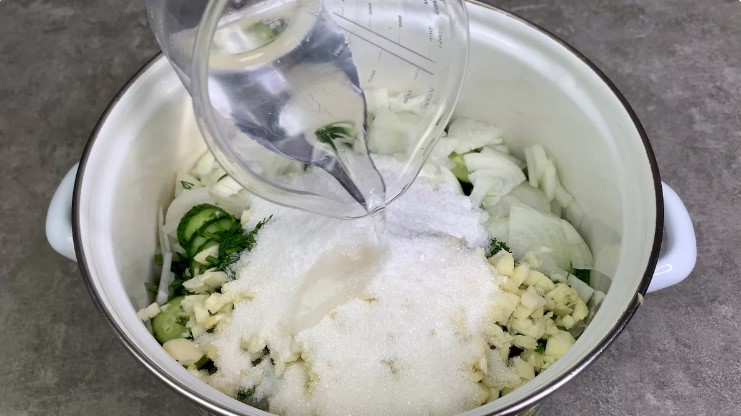 - Всипаємо цукор, сіль, вливаємо оцет і ретельно перемішуємо.