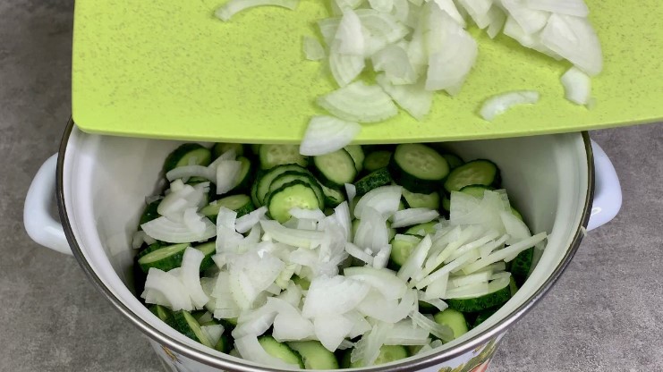 - Огірки нарізаємо на кружечки, цибулю нарізаємо на чверть-кільця і пересипаємо в один придатний за розмірами посуд.
