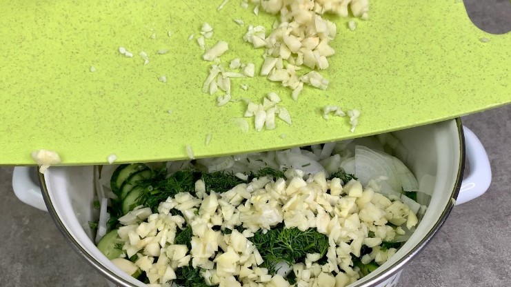 - До овочів додаємо дрібно нарізаний кріп та часник.