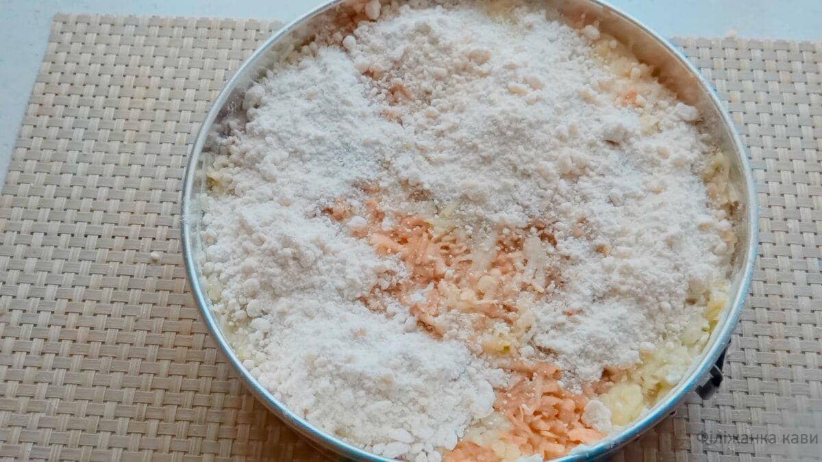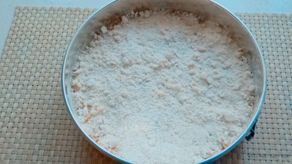 На сирну начинку сиплемо знову чверть пісочної крихти. Потім другу половину яблучної начинки і крихту, що залишилася.