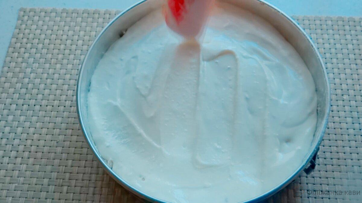Дно роз’ємну форми діаметром 22 см застеляємо пергаментом, боки змащуємо маслом і викладаємо 1/4 частина тіста, злегка утрамбовуємо.
