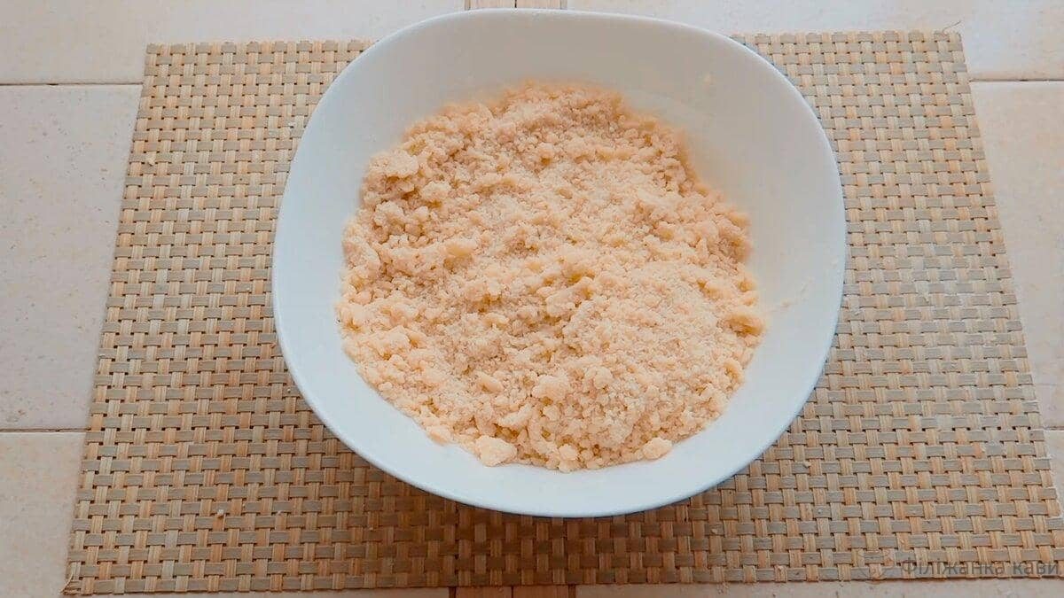 Змішуємо сухі компоненти між собою: манку, просіяне борошно, розпушувач і цукор. Додаємо до них натерте вершкове масло і яйце. Руками перетираємо – має вийти трохи вологе розсипчасте тісто, яке ділимо на 4 частини.