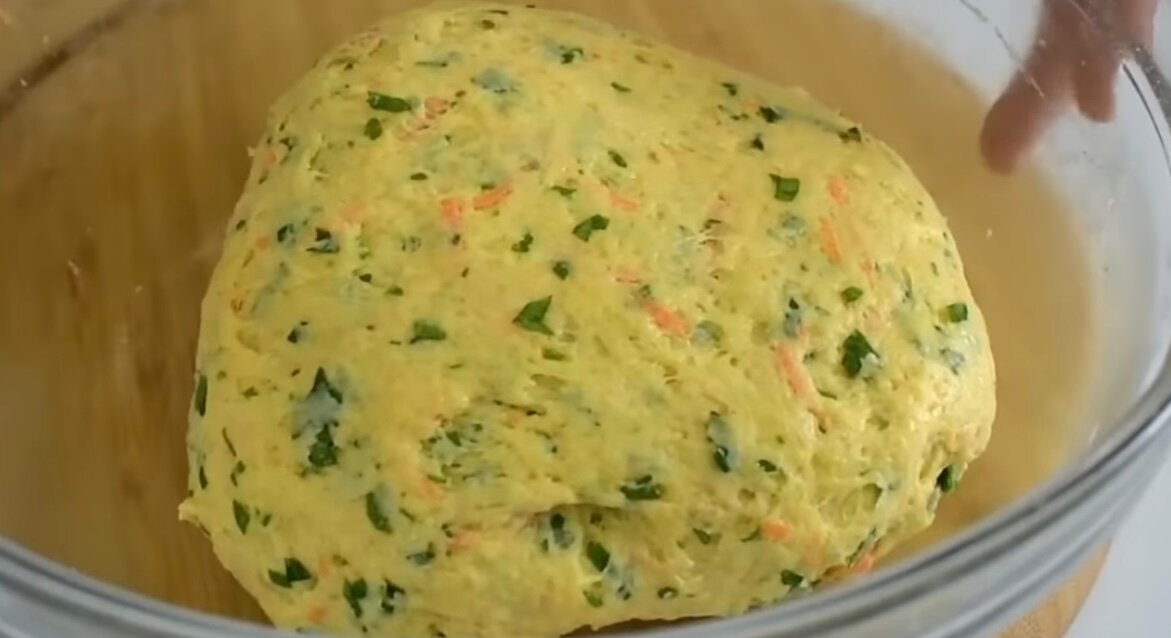 Додаємо все борошно і гарненько розмішуємо. Додаємо терту моркву, подрібнену петрушку і вимішуємо тісто руками. Має вийти м’яке, але не липке тісто.